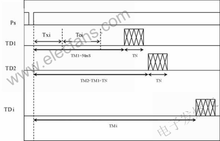圖2描述了進(jìn)行數(shù)據(jù)通信的時(shí)序關(guān)系,當(dāng)光接收器輸出信號(hào)出現(xiàn)下降沿(即Ps=0)時(shí),表示接收到主機(jī)的信號(hào),上升沿到來時(shí)開始計(jì)時(shí),而且以后的數(shù)據(jù)傳送也是以這個(gè)上升沿為參照標(biāo)準(zhǔn)。測(cè)量時(shí)間Txi +T0i 和Txj+T0j不大于40ms。對(duì)于第一個(gè)測(cè)量部件在同步信號(hào)啟動(dòng)測(cè)量以后再延時(shí)TM1≥Txi +T0i就可以傳送數(shù)據(jù)了。為了可靠,本設(shè)計(jì)取TM1=50ms作為測(cè)量過程的延遲時(shí)間。設(shè)每次傳送數(shù)據(jù)的時(shí)間為TN,那么第二個(gè)測(cè)量部件傳送數(shù)據(jù)的延時(shí)就是第一個(gè)延遲時(shí)間加上TN,即:TM2= TM1+TN,后面的延時(shí)TM的計(jì)算依次類推。