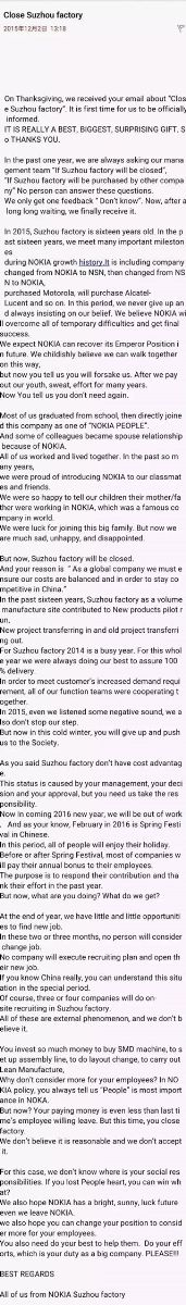 11月26日,西方感恩節(jié)。蘇州諾基亞工廠全體員工在這一天收到資方通知——工廠即將于12月31日最終關(guān)閉。