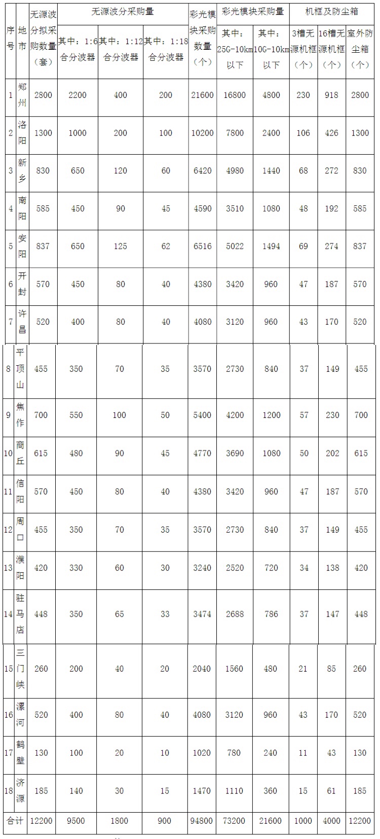 中標份額:1:6合分波器3030套,1:12合分波器570套,1:18合分波器285套,25G彩光模塊23310個,10G彩光模塊6840個,3槽無源機框318個,16槽無源機框1274個,室外防塵箱3885個;