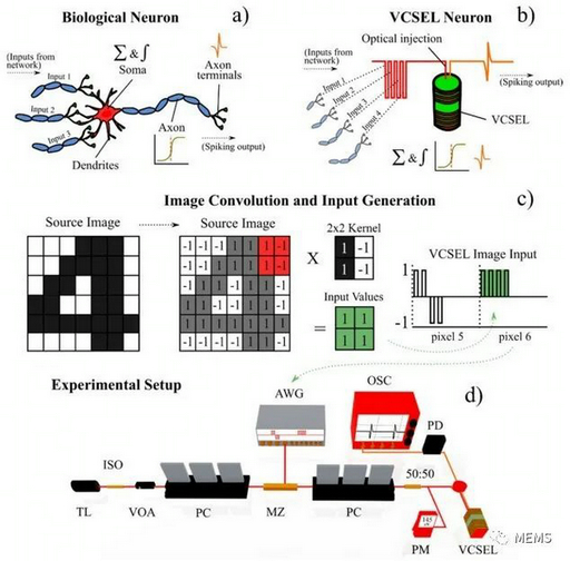 除此之外,半導(dǎo)體激光器還顯示出作為高速人工光學(xué)脈沖神經(jīng)元的能力,模擬大腦中生物神經(jīng)元的功能和脈沖操作。在半導(dǎo)體激光器中,垂直腔面發(fā)射激光器(vertical cavity surface emitting lasers,VCSEL)因其獨(dú)特的特性(如高速、易于集成在2D陣列中、與光纖的高耦合效率等)而備受關(guān)注。