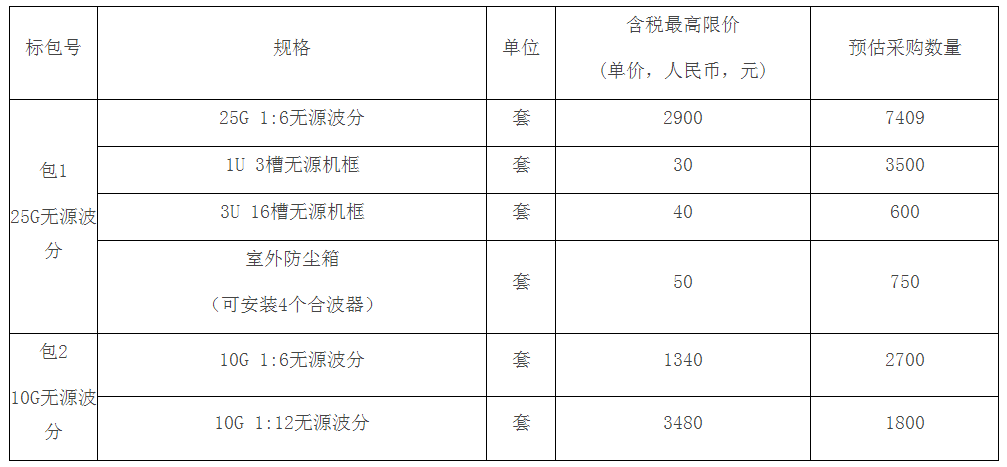 根據(jù)之前招標公告,本次采購內(nèi)容包括:標包1為無源光纖復(fù)用設(shè)備個7409套和無源光纖復(fù)用設(shè)備配件個4850套,標包2無源光纖復(fù)用設(shè)備4500套。