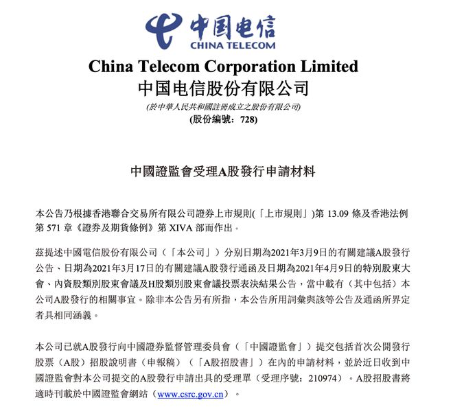 摘要:4月27日晚,中國電信在港交所公告,公司已就A股發(fā)行向中國證券監(jiān)督管理委員會提交包括首次公開發(fā)行股票招股說明書在內(nèi)的申請材料,并于近日收到中國證監(jiān)會對本公司提交的A股發(fā)行申請出具的受理單。