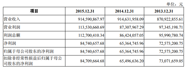 據(jù)溫州意華招股書說(shuō)明,2013-2015年主營(yíng)業(yè)務(wù)綜合毛利率分別為28.13%、26.49%和28.93%,而網(wǎng)易財(cái)經(jīng)消息透露2014-2016年溫州意華實(shí)現(xiàn)營(yíng)業(yè)收入9.15億元、9.15億元和9.91億元,同期凈利潤(rùn)為6536.47萬(wàn)元、8474.07萬(wàn)元和9910.4萬(wàn)元。