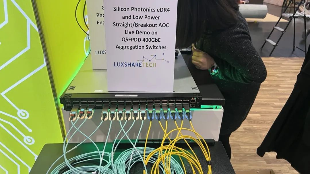 展會期間,由立訊技術(Luxshare-Tech)與某全球知名ICT科技集團聯(lián)合研發(fā)的低功耗互連解決方案正式亮相。該方案基于400G以太網交換機平臺,涵蓋硅光子QSFP-DD DR4光收發(fā)器、QSFP-DD To QSFP-DD AOC、QSFP-DD To 2xQSFP56 Breakout AOC和QSFP-DD To 4xQSFP28 Breakout AOC等產品。