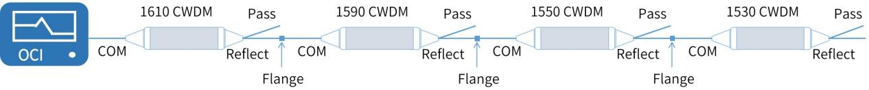 待測(cè)光纖鏈路由4個(gè)波段不同的粗波分復(fù)用器(CWDM)級(jí)聯(lián)組成,如圖1所示。上個(gè)CWDM的反射端(Reflect)和下個(gè)CWDM的公共端(COM)用法蘭(Flange)連接,依次連接4個(gè)不同波段的CWDM,第1個(gè)CWDM的COM端和OCI1500設(shè)備的DUT接口連接。
