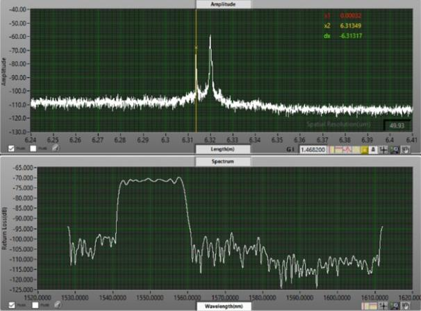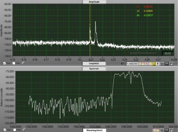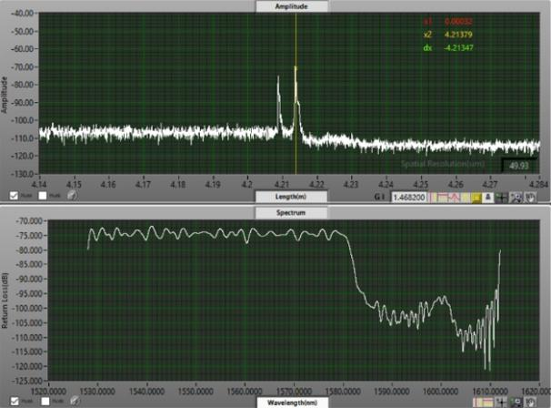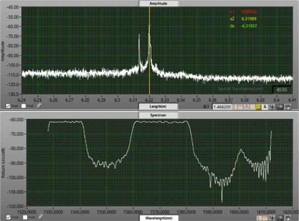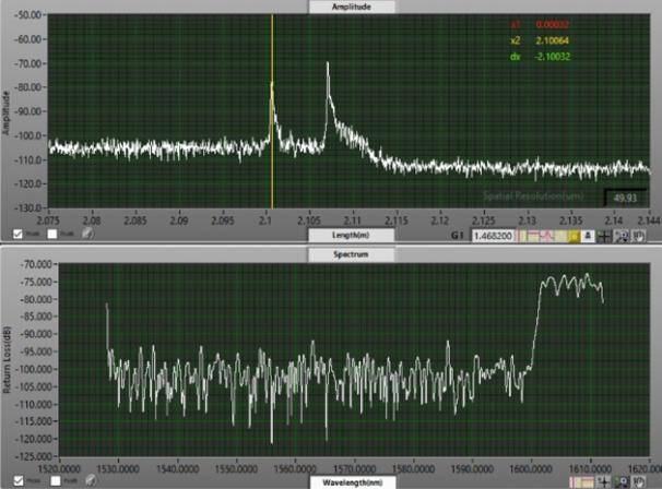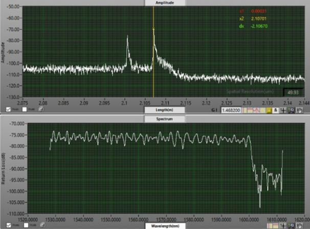 從圖3(a)中可以看出,光譜信息可以看到1528~1612nm范圍內(nèi)的信息,回波損耗曲線上2.10032m處的反射峰回波強(qiáng)度約為-75dB,其光譜信息上1600~1612nm的波段回?fù)p強(qiáng)度約為-75dB,而Pass通道允許通過(guò)的波長(zhǎng)范圍為1600~1620nm,說(shuō)明2.10032處為Pass通道的反射峰,同理從圖3(b)中可以看出2.10670m處為Reflect通道反射峰。