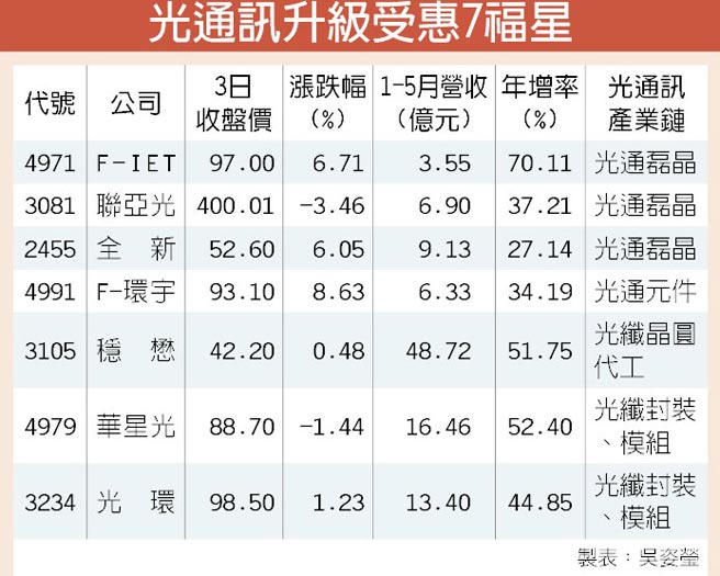 受惠光通訊需求爆發(fā)的公司,從上游聯(lián)亞光(3081)、F-IET(4971)、中段F-環(huán)宇(4991)、穩(wěn)懋(3105)、下游光環(huán)(3234)、華星光(4979)等公司,前5月累積營(yíng)收有高達(dá)70.11%~34.19%的年增率,表現(xiàn)優(yōu)異。