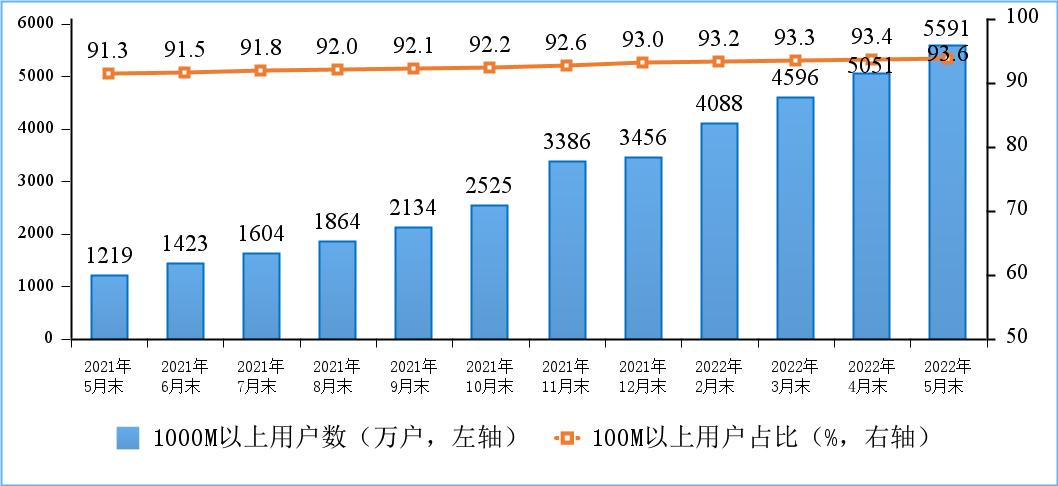 根據(jù)2021年工信部發(fā)布的《“雙千兆”網(wǎng)絡(luò)協(xié)同發(fā)展行動計(jì)劃》(2021年-2023年),到2023年底,千兆光纖網(wǎng)絡(luò)具備覆蓋4億戶家庭的能力,10G PON及以上端口規(guī)模超過1000萬個(gè),千兆寬帶用戶突破3000萬戶。截止今年5月,上述目標(biāo)均已完成,千兆寬帶用戶發(fā)展速度更是遠(yuǎn)超計(jì)劃。