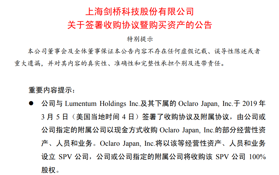ICCSZ訊 3月5日早間消息,ICT行業(yè)ODM/JDM/EMS供應(yīng)商上海劍橋科技股份有限公司(簡稱劍橋科技)在上交所發(fā)布公告,公司與Lumentum Holdings Inc.及其下屬的Oclaro Japan, Inc.于2019年3月5日(美國當(dāng)?shù)貢r間4 日)簽署了收購協(xié)議及附屬協(xié)議,由公司或公司指定的附屬公司以現(xiàn)金方式收購Oclaro Japan, Inc.的部分經(jīng)營性資產(chǎn)、人員和業(yè)務(wù)。Oclaro Japan, Inc.將以該等經(jīng)營性資產(chǎn)、人員和業(yè)務(wù)設(shè)立SPV公司,公司或公司指定的附屬公司將收購該SPV公司100%股權(quán),交易價格為4160萬美元。
