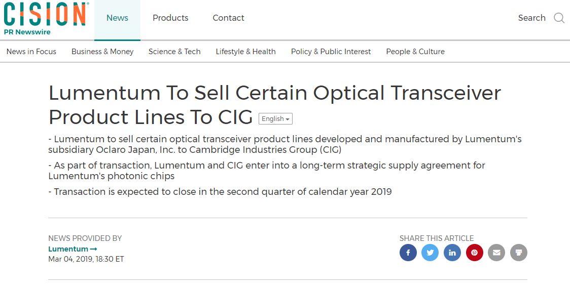 值得注意的是,作為劍橋科技收購Lumentum旗下Oclaro Japan光收發(fā)器產(chǎn)品線交易的一部分,Lumentum還和劍橋科技簽訂了光芯片的長期戰(zhàn)略供應(yīng)協(xié)議。該交易預(yù)計將在2019年第二季度結(jié)束。