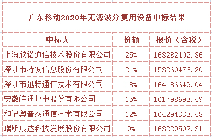 ICCSZ訊(編輯:Aiur) 近日,廣東移動(dòng)公布2020年無(wú)源波分復(fù)用設(shè)備公開招標(biāo)項(xiàng)目中標(biāo)結(jié)果,欣諾通信、特發(fā)信息、迅特通信、安徽皖通郵電、和記奧普泰通和瑞斯康達(dá)中標(biāo)入圍。具體份額如下: