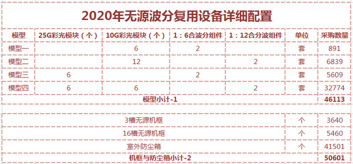 根據(jù)招標(biāo)文件,本次集采的無(wú)源波分復(fù)用設(shè)備根據(jù)省內(nèi)需求分4個(gè)模型,共計(jì)46113套,各模型詳細(xì)配置如下: