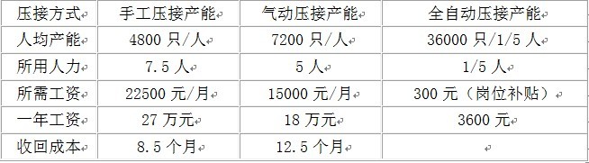 說明:以上是全自動壓接系統(tǒng)按照12小時工作時間計算的,如果有保安值班讓全自動設(shè)備24小時工作,其效率能夠提升一倍!