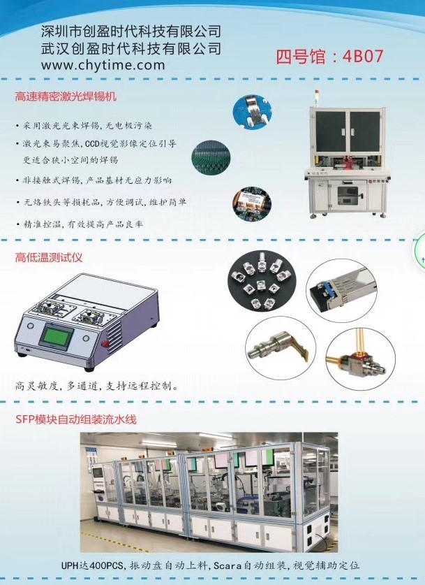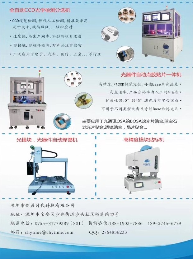 ICCSZ訊 9月4-7日,深圳創(chuàng)盈時(shí)代科技有限公司攜子公司——武漢創(chuàng)盈時(shí)代科技有限公司參展CIOE 2019,重點(diǎn)推出光器件濾波片點(diǎn)膠貼合一體機(jī)、激光錫膏(軟帶與PCBA)焊錫機(jī)、器件與軟帶(器件管腳與PCBA)焊錫機(jī)、光模塊貼標(biāo)機(jī)、光模塊/器件高低溫循測試儀、光模塊自動(dòng)組裝流水線等光通信行業(yè)自動(dòng)化生產(chǎn)工藝設(shè)備,展位號(hào):4號(hào)館4BO7,誠摯歡迎行業(yè)新老朋友蒞臨展位參觀及交流。