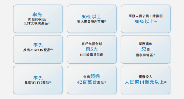 業(yè)務(wù)方面,劍橋科技是全球少數(shù)同時(shí)提供光通信、寬帶及無(wú)線技術(shù)相關(guān)連接解決方案的公司。在寬帶產(chǎn)品領(lǐng)域,公司的XGS PON產(chǎn)品在全球10GPON市場(chǎng)份額超過(guò)30%,并率先實(shí)現(xiàn)25GPON量產(chǎn)和50GPON部署。無(wú)線產(chǎn)品方面,公司全球首發(fā)Wi-Fi 7產(chǎn)品,并與Google Fiber合作推出業(yè)界首款20G上行Wi-Fi 7網(wǎng)關(guān)。光模塊產(chǎn)品覆蓋100G至1.6T互連速度,是全球首批部署800G和1.6T光模塊產(chǎn)品的企業(yè)之一。