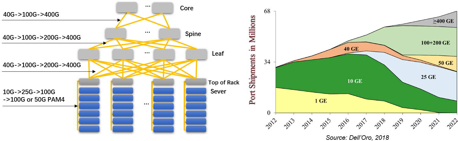 ICCSZ訊 憑借對數(shù)據(jù)中心市場由來已久的介入和觀察,易飛揚提出專為部署下一代數(shù)據(jù)中心光互連的路徑架構(gòu)建議,即數(shù)據(jù)中心交換機從100G 過渡演進到 200G ,然后再升級400G ,平滑升級和技術(shù)過渡的路徑符合技術(shù)和市場發(fā)展的規(guī)律。