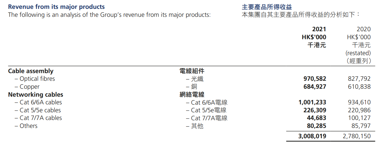 截至2021年9月30日未經(jīng)審計的2022財年上半年營業(yè)收入為港幣17.40億元,歸母凈利潤為港幣9118.7萬元;截至2021年3月31日的該公司2021財年營業(yè)收入為港幣30.08億元,歸母凈利潤為港幣2.26億元,而根據(jù)匯聚科技2021年報顯示,網(wǎng)絡(luò)電線的Cat 6/6A電線收入達10.01億港元,電線組件的光纖產(chǎn)品的收入達到9.7億港元。