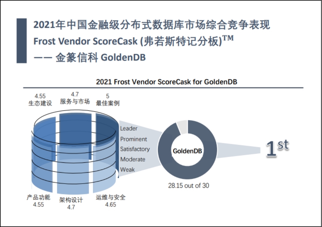 沙利文聯(lián)合頭豹研究院研究發(fā)現(xiàn),中國金融級分布式數(shù)據(jù)庫處于成熟落地的高增長市場階段,因此,針對報告中的競爭主體根據(jù)其在產(chǎn)品功能、架構(gòu)設(shè)計、運維與安全、生態(tài)建設(shè)、服務(wù)與市場、最佳案例六個維度二十八項大指標(biāo),對中國金融級分布式數(shù)據(jù)庫市場競爭力多因素分層次評估。最終由 Frost Vendor ScoreCask 綜合評分,金篆信科 GoldenDB分布式數(shù)據(jù)庫榮膺2021年金融級分布式數(shù)據(jù)第一位置。