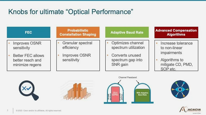 Acacia產(chǎn)品管理與戰(zhàn)略總監(jiān)Anuj Malik概述了以性能為中心的相干模塊。這些模塊的主要目標(biāo)是幫助降低網(wǎng)絡(luò)運(yùn)營商的資本支出(CAPEX)和運(yùn)營支出(OPEX)。收發(fā)器的每比特成本和再生次數(shù)是CAPEX的關(guān)鍵驅(qū)動(dòng)因素。功率、Footprint和可管理性是OPEX的關(guān)鍵驅(qū)動(dòng)因素。