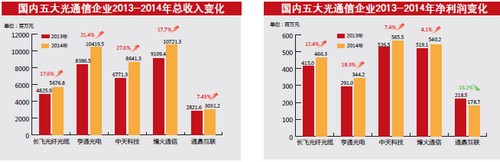 2014年,得益于“寬帶中國”戰(zhàn)略的深入推進(jìn),運(yùn)營商持續(xù)大力發(fā)展4G網(wǎng)絡(luò)基礎(chǔ)設(shè)施的建設(shè),以及政府提倡的“互聯(lián)網(wǎng)+”行動計劃,國內(nèi)光纖和光纜的市場需求不斷上升,推動國內(nèi)光通信企業(yè)整體業(yè)績持續(xù)走高。