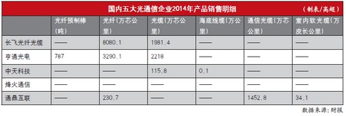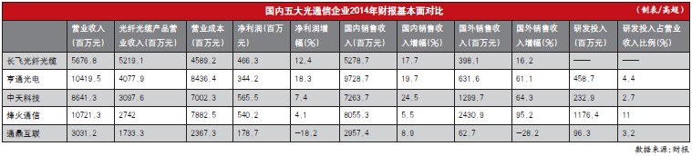 據(jù)財報,烽火通信和亨通光電均在2014年取得了超過百億元的營業(yè)收入,分別為107.2億和104.2億元,分別較2013年增長17.7%和21.4%。而中天科技則是行業(yè)內(nèi)成長較快的企業(yè)之一,2014年營業(yè)收入為86.4億元,同比增長高達(dá)27.6%。