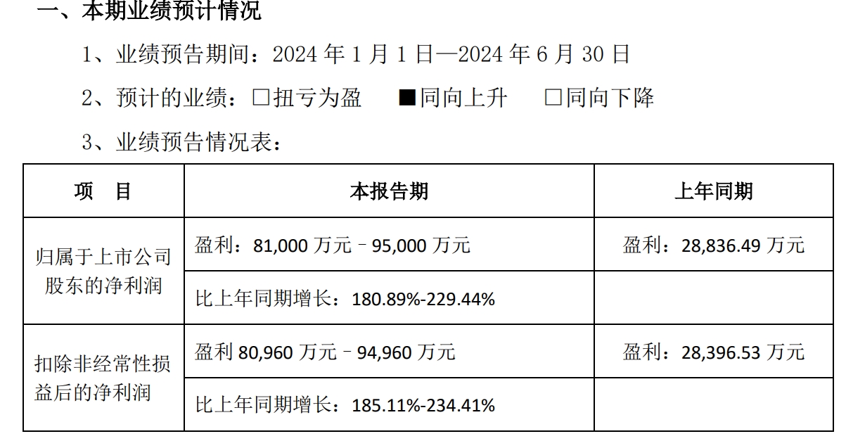 ICC訊 近日,成都新易盛通信技術(shù)股份有限公司(簡稱新易盛)發(fā)布2024年半年度業(yè)績預(yù)告,公司預(yù)計歸屬于上市公司股東的凈利潤81,000萬元–95,000萬元,比上年同期增加180.89%-229.44%,公司受益于行業(yè)景氣度持續(xù)提升,高速率產(chǎn)品需求快速增長,預(yù)計銷售收入和凈利潤較上年同期大幅增加。