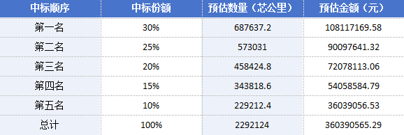 本項目不劃分標包,將確定 5 家中標人,對應份額占比分別為 30%、25%、20%、15%、10%,各份額對應的預估數(shù)量及含稅金額如表所示: