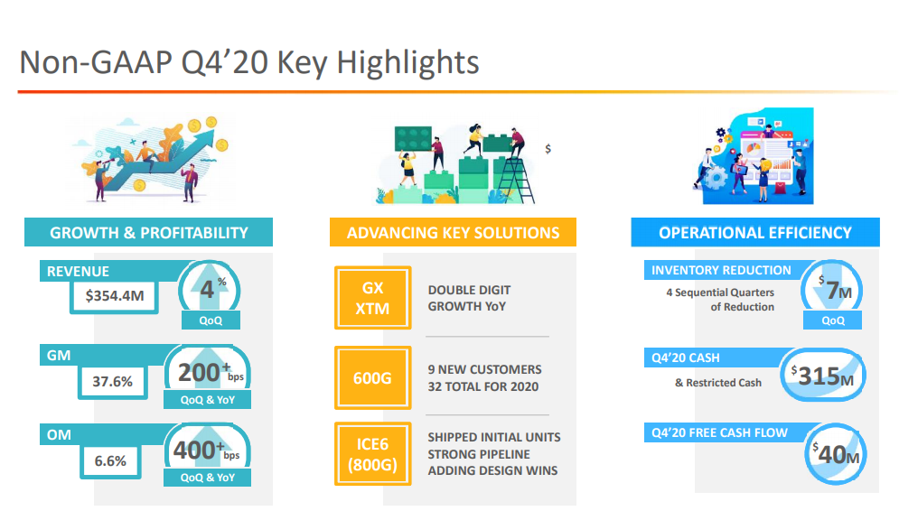 2020年第四季度,Infinera非 GAAP銷售收入3.54億美元,上個季度3.41億美元,去年同期3.87億美元。非GAAP毛利率37.6%,上個季度35.2%,去年同期35.2%。非GAAP凈收入2630萬美元,或每股盈利13美分;上個季度非GAAP凈收入420萬美元,或每股盈利2美分;去年同期非GAAP凈收入640萬美元,或每股盈利3美分。
