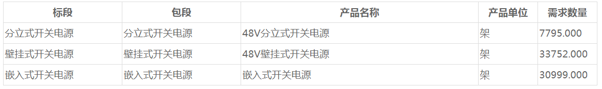 根據(jù)此前招標公告顯示:中國移動2020年至2021年開關電源產(chǎn)品集采,采購產(chǎn)品包括48V分立式開關電源、48V壁掛式開關電源、嵌入式開關電源,預估采購規(guī)模48V分立式開關電源7,795套、48V壁掛式開關電源33,752套、嵌入式開關電源30,999套,采購滿足期為1年。