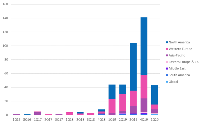 Figure 1: Private network activity count, by region, 2016–1Q20