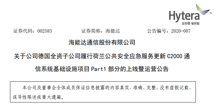 ICCSZ訊 (編輯:Nicole)近日,海能達通信股份有限公司(以下簡稱:海能達或公司)發(fā)布關(guān)于公司德國全資子公司履行荷蘭公共安全應(yīng)急服務(wù)更新 C2000 通信系統(tǒng)基礎(chǔ)設(shè)施項目 Part1 部分(以下簡稱“荷蘭C2000項目”)的上線暨運營公告稱:自 2015 年 3 月開始,海能達陸續(xù)公告了旗下德國子公司 Hytera Mobilfunk GmbH(以下簡稱“HMF”)承建的荷蘭C2000項目的中標(biāo)及項目進展情況。公司中標(biāo)的荷蘭 C2000 項目累計總金額 1.28 億歐元(約合人民幣 9.86 億元),其中包括基站設(shè)備及系統(tǒng)遷移 1.053 億歐元(約合人民幣 8.13 億元)和維保服務(wù) 2,240 萬歐元(約合人民幣 1.73 億元)。