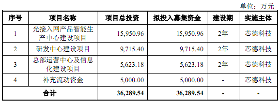 ICC訊 近日,廣州芯德通信科技股份有限公司(簡稱芯德通信)發(fā)布首次公開發(fā)行股票并在創(chuàng)業(yè)板上市招股說明書,擬發(fā)行股數(shù)不超過1061萬股,預計募集資金3.63億元,用于“光接入網(wǎng)產(chǎn)品智能生產(chǎn)中心建設(shè)項目”、研發(fā)中心建設(shè)項目、總部運營中心及信息化建設(shè)項目以及補充流動資金。