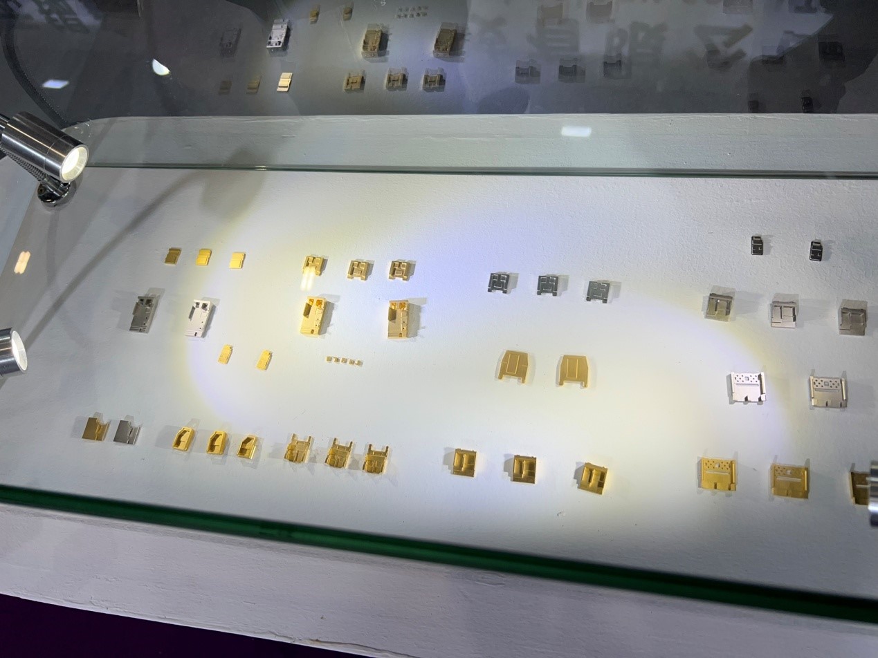 在車載光學(xué)領(lǐng)域鑫巨宏實(shí)現(xiàn)重大突破,光學(xué)組件拿到國內(nèi)頭部新勢力車企訂單數(shù)億元,并于明年大規(guī)模交付。在光通信應(yīng)用產(chǎn)品方面,無錫鑫巨宏可以提供一系列800G Lens Array、COB/COF光學(xué)透鏡、單模Lens和HDMI Lens Array等光學(xué)元件產(chǎn)品,可應(yīng)用于高速光模塊。同時,光模塊可伐鎢銅光電底座和管殼是無錫鑫巨宏展示的另一個主力產(chǎn)品系列,該系列產(chǎn)品得益于公司420臺高速CNC加工中心,具備把金屬結(jié)構(gòu)件(BOX、熱沉類)從粉末冶金(MIM)到CNC加工以及電鍍的全制程垂直整合能力。