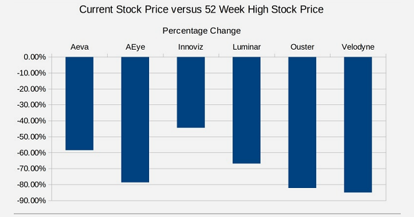 考慮到這一背景,下圖中顯示的數(shù)據(jù)就不奇怪了。市場(chǎng)回調(diào)重創(chuàng)了LightCounting追蹤的6家西方上市激光雷達(dá)制造商,以及美國(guó)和歐洲的許多其他高科技公司的股價(jià)。投資者擔(dān)心的另一個(gè)問(wèn)題是,下圖所示的所有供應(yīng)商都是小型企業(yè),如果不是SPAC(Special Purpose Acquisition Companies,特殊目的收購(gòu)公司),這些企業(yè)永遠(yuǎn)不會(huì)公開(kāi)交易。其中規(guī)模最大的Velodyne去年的收入約為6000萬(wàn)美元。