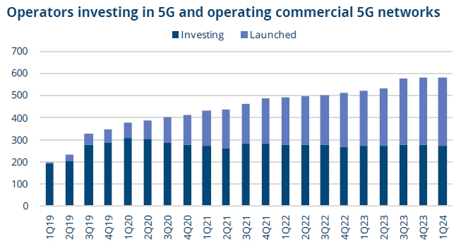 ICC訊(編譯:Nina)根據(jù)GSA(全球移動供應(yīng)商協(xié)會)最新統(tǒng)計數(shù)據(jù),截至2024年3月底,GSA已確定全球有175個國家(1月底時為176家)和地區(qū)的585家運營商(1月底時為585家)在投資5G,投資方式包括試驗、獲取許可證、規(guī)劃、部署網(wǎng)絡(luò)和商用。這一數(shù)字不包括近200家在美國拍賣CBRS頻譜時獲得優(yōu)先接入許可證的公司,這些頻譜可能用于5G。