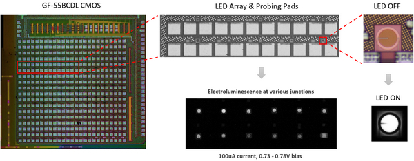 他們設(shè)計了一種微米級大小正向偏置全硅基 LED,在完全集成于 55 納米制程商用 CMOS 微電子芯片(無任何實驗室處理)的基礎(chǔ)上實現(xiàn)了低電壓、高速高亮的近紅外發(fā)光,其發(fā)光強度和調(diào)制解調(diào)速度可同時達到此前類似器件實驗室記錄的十倍以上。