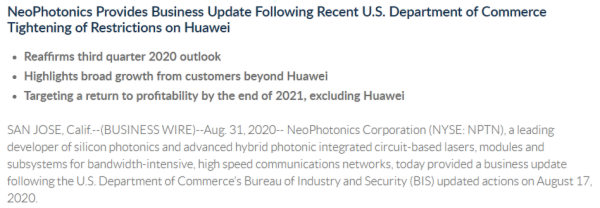 ICC訊(編譯:Nina)美國(guó)加州時(shí)間,2020年8月31日--NeoPhotonics公司(紐交所:NPTN),一家為帶寬密集型高速通信網(wǎng)絡(luò)開(kāi)發(fā)基于硅光子和先進(jìn)混合光子集成電路的激光器、模塊和子系統(tǒng)的領(lǐng)先提供商,今天提供針對(duì)美國(guó)商務(wù)部工業(yè)與安全局(BIS)在8月17日發(fā)布對(duì)華為的修訂版禁令后的業(yè)務(wù)更新。
