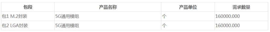 摘要:中國(guó)移動(dòng)擬采購(gòu)5G通用模組32萬(wàn)片,其中LGA封裝16萬(wàn)片,M.2封裝16萬(wàn)片,按照封裝劃分為采購(gòu)包1- M.2,采購(gòu)包2- LGA。