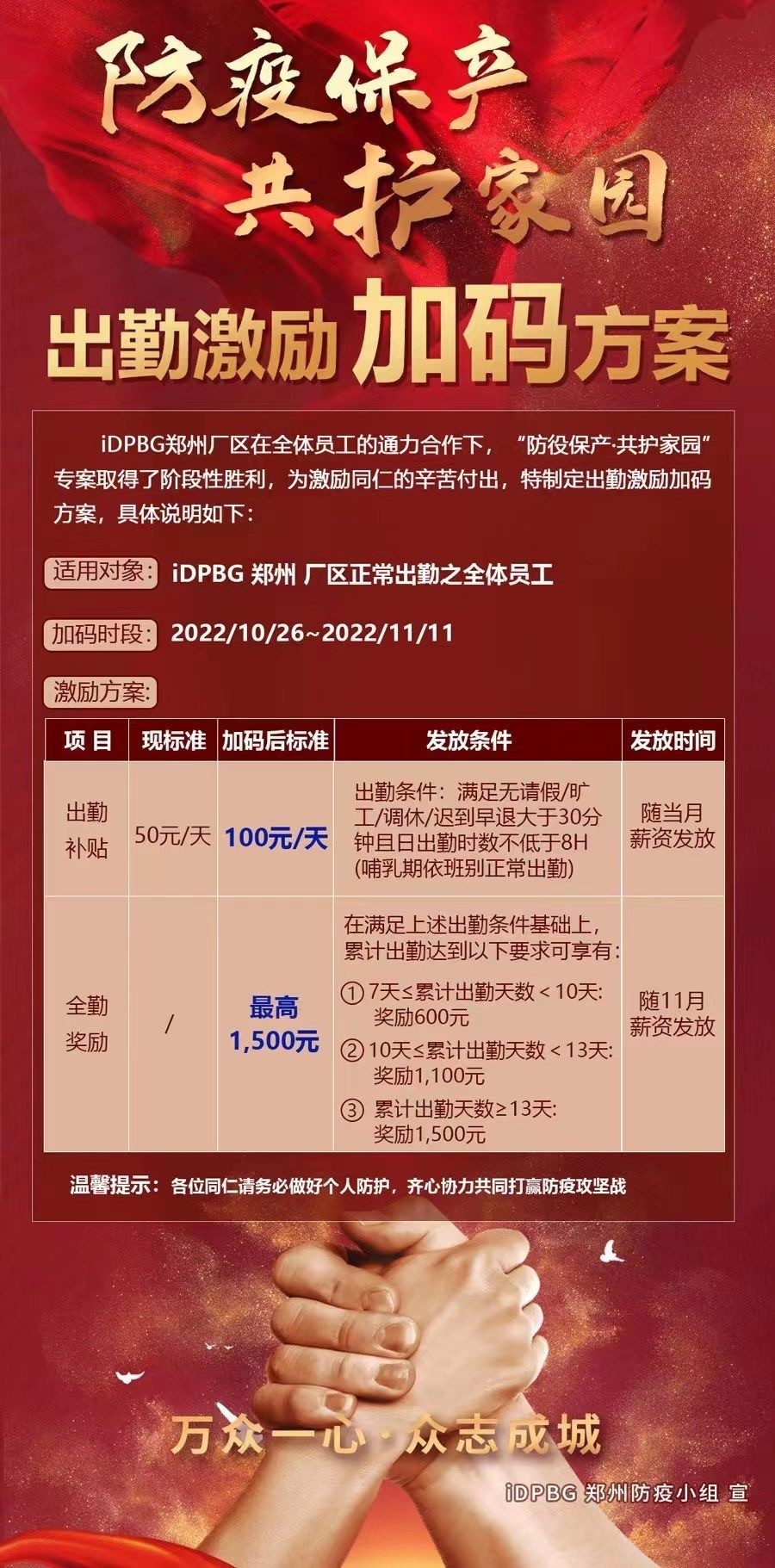 一位在10月30日離開港區(qū)富士康的前員工告訴界面新聞,疫情發(fā)生以來,工廠從未停止生產(chǎn),為激勵員工出勤還開出了補(bǔ)助。10月26日以前,正常出勤的員工可獲得50元/天的補(bǔ)貼,在10月26日以后,這一補(bǔ)貼加碼至100元/天,全勤則最高獎勵1500元。這位員工在負(fù)責(zé)iPhone成品組裝的IDPBG事業(yè)群,這也是港區(qū)富士康規(guī)模最大的事業(yè)群。