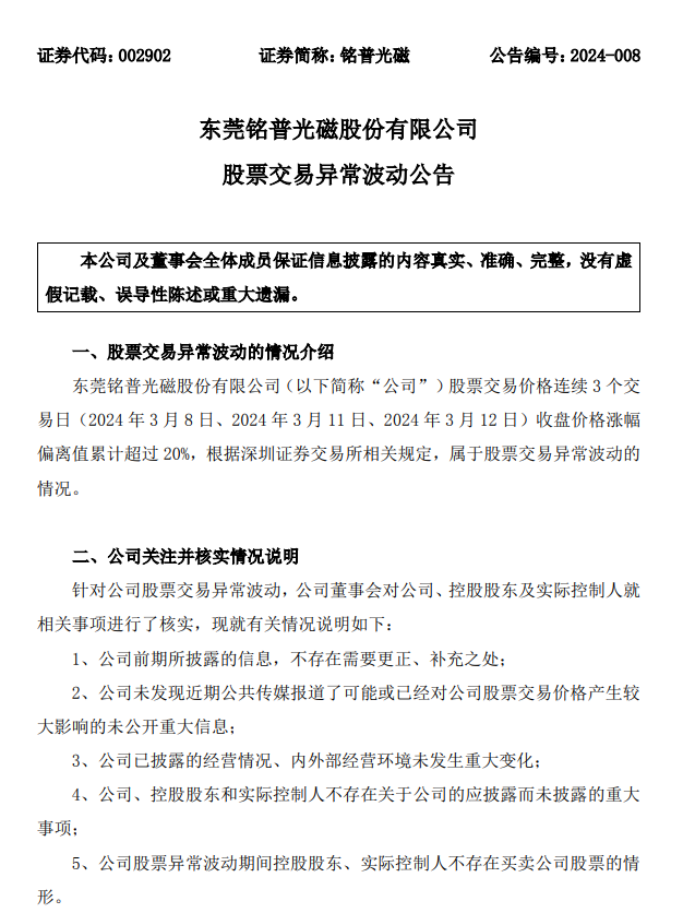 公告稱,自3月8日以來,銘普光磁股票交易價格連續(xù)3個交易日收盤價格漲幅偏離值累計(jì)超過20%,根據(jù)深交所相關(guān)規(guī)定,屬于股票交易異常波動的情況。