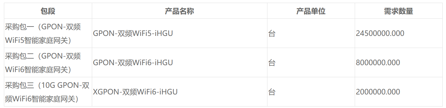 ICC訊(編輯:Aiur)12月15日,中國移動官網(wǎng)發(fā)布2020年至2021年智能家庭網(wǎng)關(guān)產(chǎn)品集中采購(公開部分),項目分為3個采購包,計劃采購GPON-雙頻WiFi 5智能家庭網(wǎng)關(guān)2450萬臺,GPON-雙頻WiFi 6家庭網(wǎng)關(guān)800萬臺和10G GPON-雙頻WiFi 6智能家庭網(wǎng)關(guān)200萬臺,需求數(shù)量合計3450萬臺。