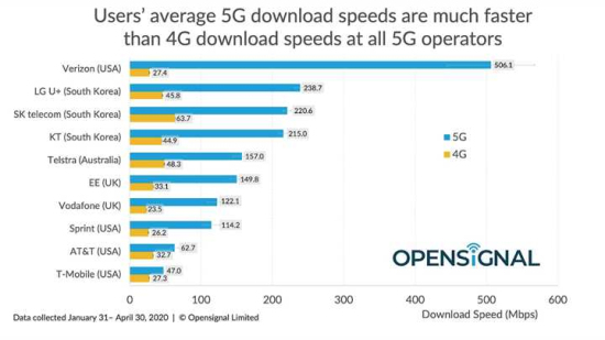 5G速度很快,但各家運(yùn)營(yíng)商的速度也有所不同。在被研究的10家運(yùn)營(yíng)商中,5G速度比4G快18.4倍至1.7倍,Verizon的網(wǎng)速為506.1 Mbps,而T-Mobile us網(wǎng)速為47 Mbps。