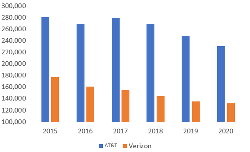 未知的是,AT&T和Verizon可以犧牲多少工作崗位而不損害其績效。在過去的五年中,他們已經削減了約五分之一的員工,實現(xiàn)了生產率的大幅提高。 AT&T的每名員工收入在2015年至2019年期間增長了40%,達到731,207美元。在Verizon,他們增長了32%,達到976,800美元。但是,AT&T今年的增長幅度較小,為744,323美元,而Verizon的出現(xiàn)小幅度下降,970,439美元。
