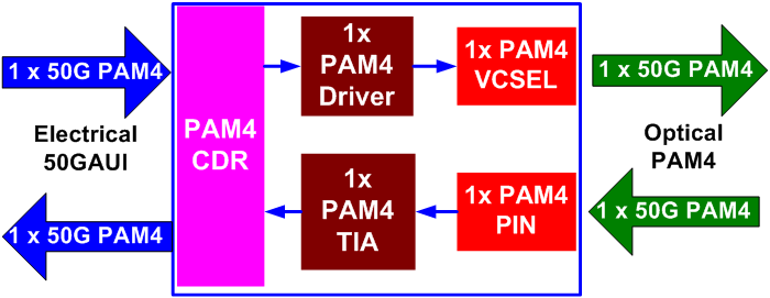海信寬帶公司成功推出了50G SFP56 PAM4產(chǎn)品,基于50GBASE-SR 100m標(biāo)準(zhǔn),依托現(xiàn)有海信自主開發(fā)的芯片直接封裝(Chip on Board)工藝,采用SFP56封裝模式,可滿足100m的傳輸距離,該產(chǎn)品電信號(hào)和光信號(hào)均為PAM4調(diào)制,如下圖。在PAM4產(chǎn)品領(lǐng)域,海信寬帶同時(shí)也在積極部署后續(xù)200G,400G產(chǎn)品開發(fā),將全面滿足未來(lái)對(duì)高速模塊的市場(chǎng)需求,為客戶提供更優(yōu)質(zhì)更具競(jìng)爭(zhēng)力的產(chǎn)品。
