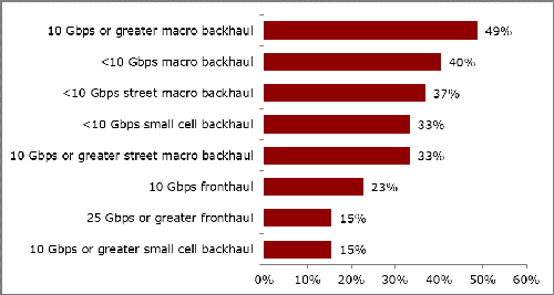 從數(shù)據(jù)中得出的有趣結(jié)論是,運(yùn)營(yíng)商認(rèn)為微波能在所有可能的用例中解決5G問題。不出所料,宏回程在微波優(yōu)先級(jí)中居首位。在受訪者中,49%的人選擇了10Gbps或更高速率的宏回程用例,而40%的人選擇了低于10Gbps的宏回程。但是其它用例的得分也很高。許多運(yùn)營(yíng)商將街道宏(Street Macro)和Small Cell回程視為可行的微波用例,其中三分之一或以上的受訪者將這兩種用例選為優(yōu)先事項(xiàng)。甚至在10Gbps數(shù)據(jù)速率下,微波前傳都在發(fā)揮作用,被23%的受訪者選為優(yōu)先選項(xiàng)。