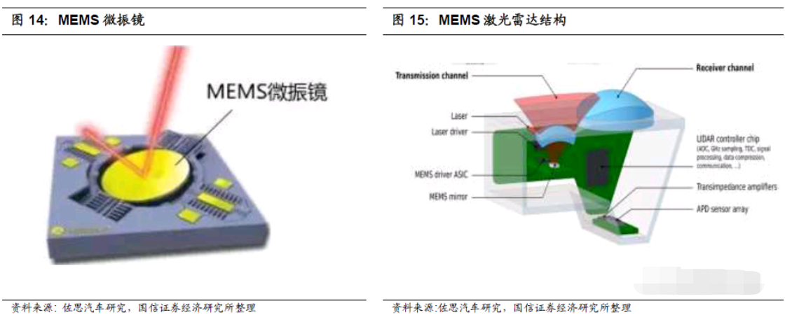 1)機械結構簡化:微振鏡幫助 MEMS 激光雷達拜托了馬達、多棱鏡等機械裝置,毫米級尺寸的微振鏡縮減了激光雷達的尺寸;