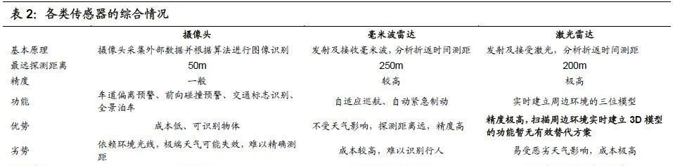 各類傳感器的性能優(yōu)劣:智能駕駛感知層的主要硬件有攝像頭、毫米波雷達和激光雷達,其中激光雷達性能最優(yōu)、成本最高,是目前實現(xiàn) 3D 空間建模的必備硬件。這三種感知硬件可以同時使用,通過卡爾曼濾波算法實現(xiàn)融合傳感: