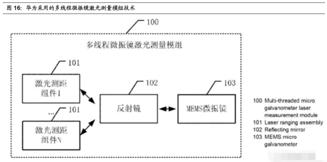 在前文中我們已經(jīng)提到,按掃描方式劃分,激光雷達可分為 MEMS、Flash、相控陣、機械旋轉式四類。根據(jù)2020年世界知識產(chǎn)權組織對華為激光雷達技術專利的披露,華為的產(chǎn)品應該屬于 MEMS 激光雷達,并且采用多線程微振鏡激光測量模組技術進行了改進。