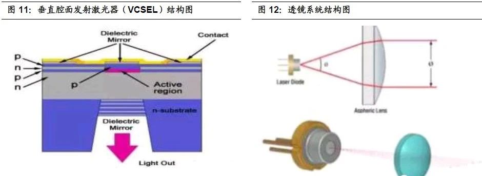 1)激光發(fā)射器有半導體激光器、固體激光器、光纖激光器和二氧化碳氣體激光器四種類型。無人駕駛大多采用半導體激光器,分為激光由邊緣發(fā)出的邊發(fā)射激光器(EEL)和激光垂直于頂面的垂直腔面發(fā)射激光器(VCSEL)。垂直腔面發(fā)射激光器,其出射光束圓形對稱,光能轉換效率高,光源具有高度一致性和高指向性等優(yōu)點,被業(yè)界看好。