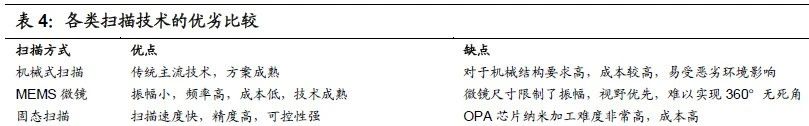1)掃描式激光雷達具體有三種技術路徑可以實現(xiàn):機械式掃描是將激光雷達安裝在車頂以一定的速度旋轉,在水平方向采用機械 360°旋轉掃描,在垂直方向采用了定向分布式掃描;MEMS(微電機系統(tǒng))微鏡是把所有機械部件集成到單個芯片上,利用半導體工藝生產(chǎn),以電的方式來控制光束;固態(tài)掃描,采用光學相控陣(OPA)技術,由元件陣列組成,通過控制每個元件發(fā)射光的相位和振幅來控制光束。